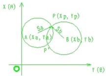 如图2所示,A、B为坐标已知的控制点,P为待求点,在A、B两点已分别利用全站仪测了距离Sa和Sb。