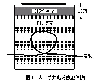 为便于工程施工和日后运营维护,外场设备供电电缆路由上均会设置人、手井。工程施工完毕后,在人、手井内灌填黄沙至距井口10cm的高度,再填充C15混凝土至井口并抹平。此防盗措施延长了盗窃行为的过程时间,从而达到防盗的目的。