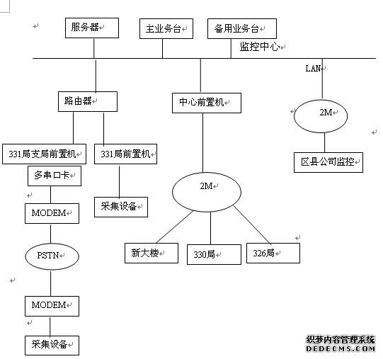 该系统传输组网方式为混合式组网方式:从模块局、支局到331局采用MODEM PSTN组网方案(固定电话半永久性连接);从331局到监控中心采用基于路由器组网的方案。
