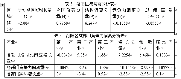 由以上得出洛阳区域偏离分析表(表3)和洛阳区域部门竞争力偏离分析表(表4):