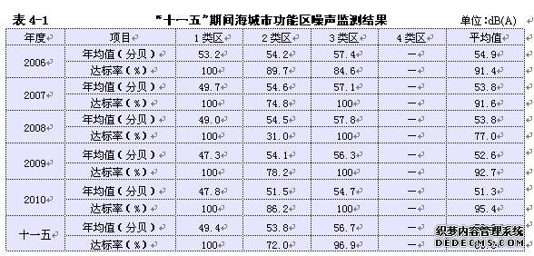 “十一五”期间海城市区域声环境质量处于好和较好区域占监测覆盖面积的59.6%以上;处于好和较好区域占监测覆盖人口的59.6%以上;到2010年没有重污染区域,噪声环境趋于好转。