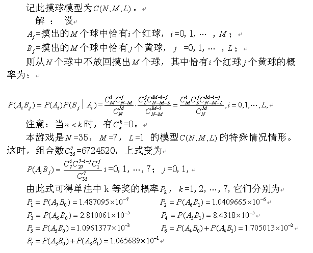 这一类型游戏实质是古典概率中的有限不放回摸球问题,可用同一方法计算单注中奖概率,为了求单注中奖概率,现考虑如下的摸球问题。