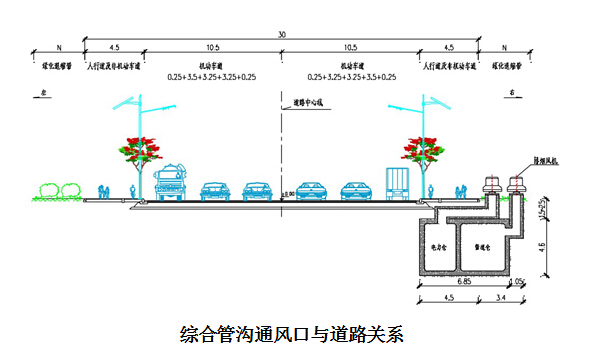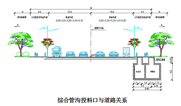 2.1平面位置:设计综合管沟设于设计道路中心线以南17.5米的非机动车道下。