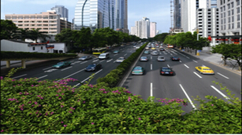 防护型干道的绿化植物主要是用来实现隔离有害有毒气体、 噪音的功能,并且兼顾观赏功能。植物的配置应选择具有抗污染、吸尘、隔离噪音的植物,如雪松、圆柏、桂花、珊瑚树、夹竹桃等。绿化设计时,采用由乔木群落向小乔木群落、灌木群落、草坪过渡的形式,形成立体层次感,既能起到良好的防护作用,又具有极好的景观效果。下图为广州东风路的道路绿化。